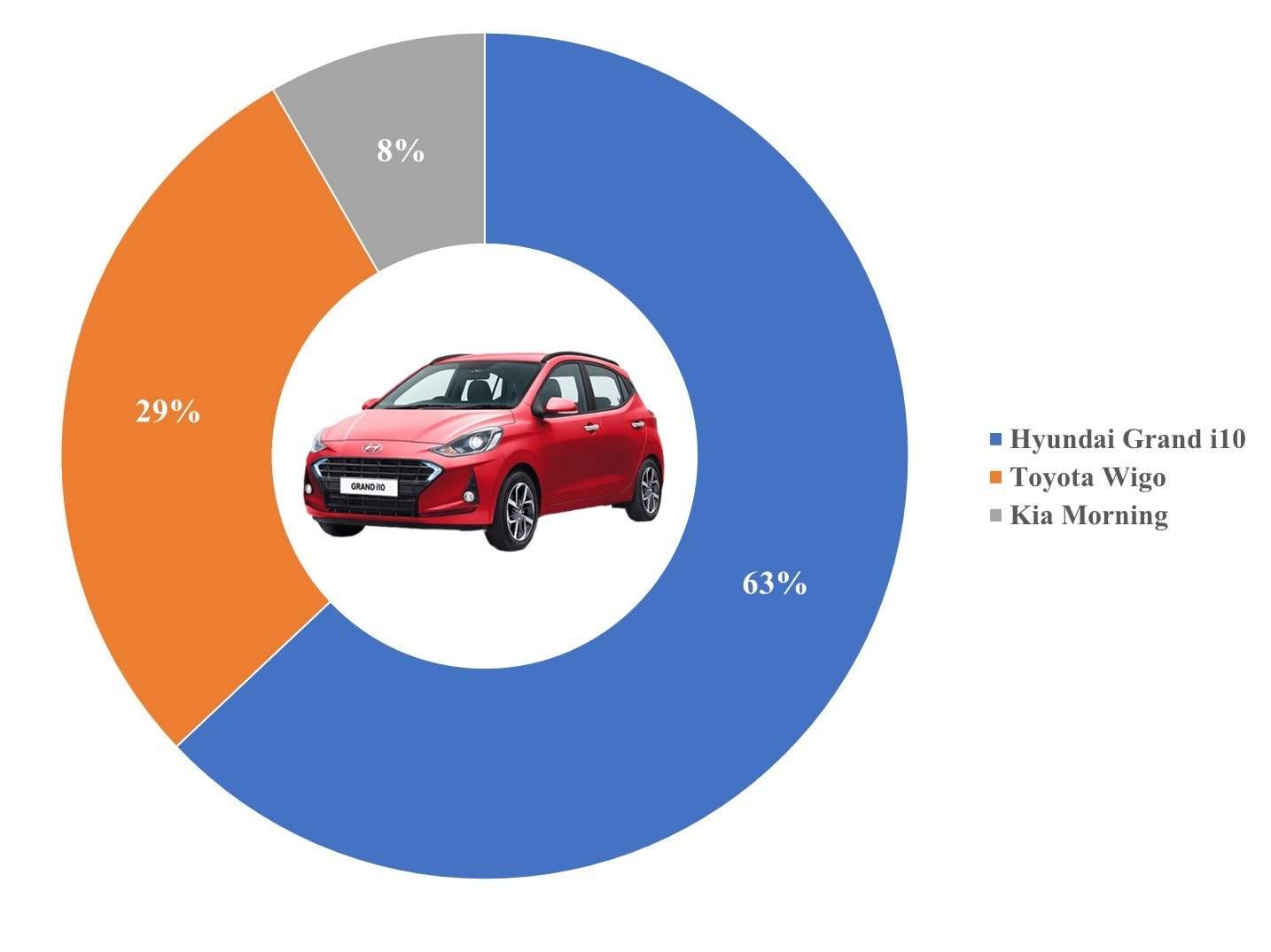 Hyundai Grand i10 tiếp tục dẫn đầu phân khúc xe đô thị hạng A khi có 5.831 xe tới tay người tiêu dùng. So với năm ngoái, Hyundai Grand i10 bán kém hơn 2.113 chiếc, giảm 26,6%.