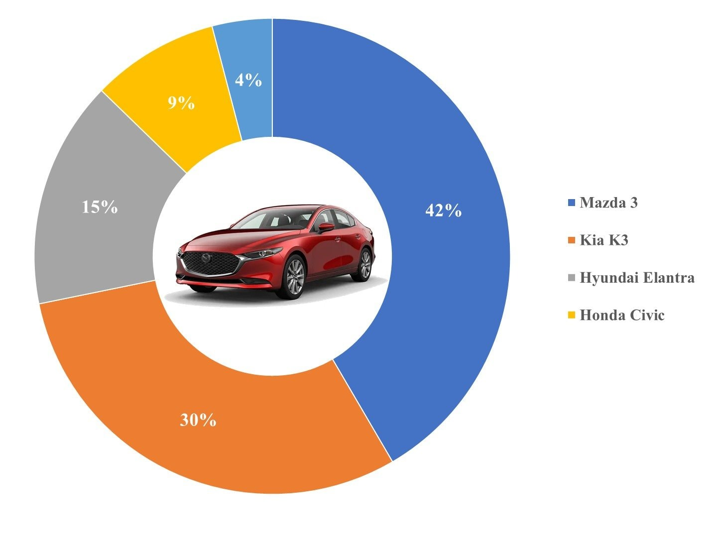 Kết thúc năm 2024, phân khúc sedan hạng C tiếp tục dẫn đầu bởi cái tên quen thuộc Mazda 3. Mẫu xe này đã bán được 4.958 chiếc trong năm 2024, giảm 26,1% theo năm. Điều này dễ dàng nhận thấy khi thị hiếu người tiêu dùng Việt đang có xu hướng chuyển sang ô tô gầm cao.