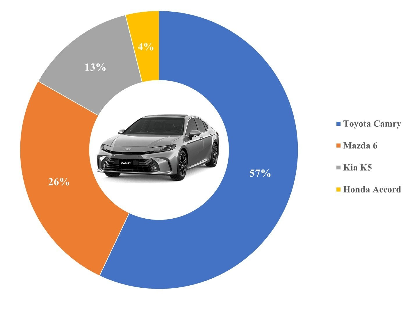 Toyota Camry vẫn làm chủ phân khúc với doanh số 1.333 xe, cao gấp hơn 2 lần so với mẫu xe ở hạng 2 là Mazda 6 (612 xe). Trong khi đó, Kia K5 chỉ bán được 301 xe.