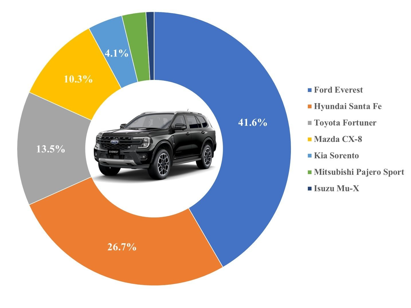 Cuộc đua doanh số SUV/crossover 7 chỗ năm 2024 khép lại với chiến thắng thuộc về Ford Everest. Doanh số của Everest lũy kế cả năm 2024 đạt 10.841 chiếc, tăng 8,1% theo năm - nắm gần 42% thị phần toàn phân khúc. Đáng chú ý, con số này còn cao gấp 1,5 lần so với mẫu xe xếp kế tiếp là Hyundai Santa Fe (6.941 chiếc).