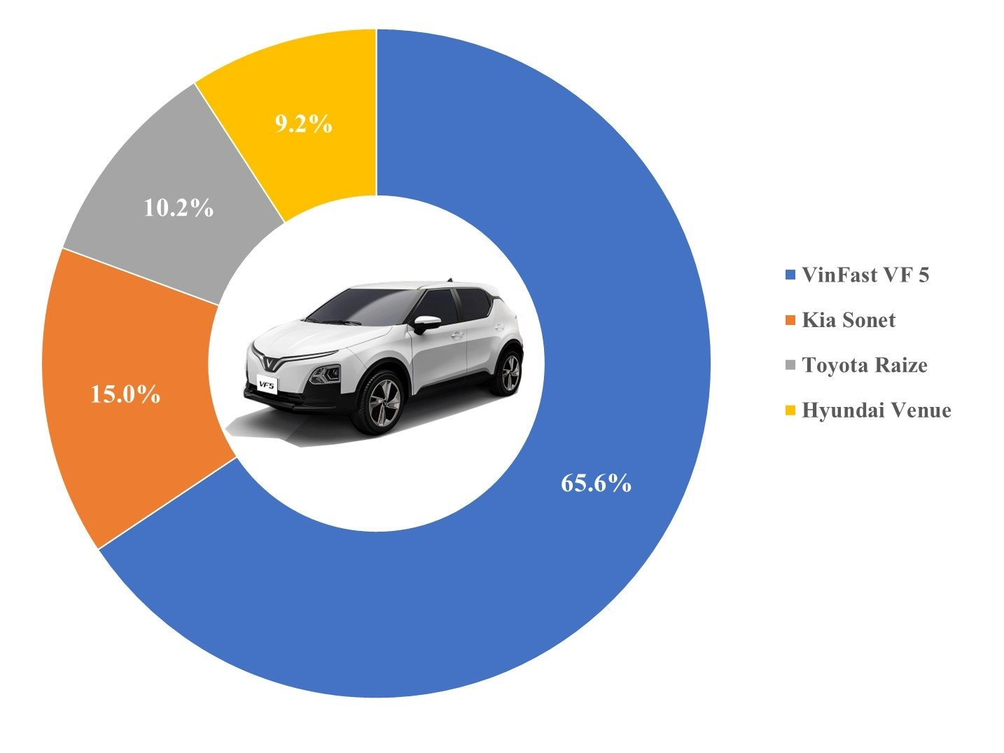 Dựa trên số liệu được công bố, có thể thấy rõ doanh số của VinFast VF 5 thậm chí còn cao gấp gần 2 lần tổng doanh số các đối thủ cộng lại. Mẫu xe điện VinFast đang nắm giữ hơn 65% thị phần phân khúc SUV hạng A.