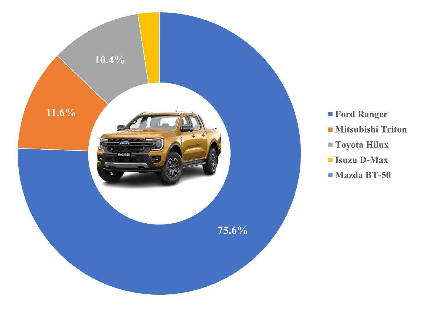 Phân khúc bán tải có 1 năm khá nhàm chán khi Ford Ranger tiếp tục áp đảo các đối thủ. Lũy kế năm 2024, Ford Ranger đạt doanh số tới 17.508 chiếc bán ra, cao gấp khoảng 3 lần tổng doanh số bán ra của các đối thủ. So với năm 2023, Ford Ranger cũng tăng nhẹ doanh số gần 10%, ghi nhận doanh số kỷ lục.