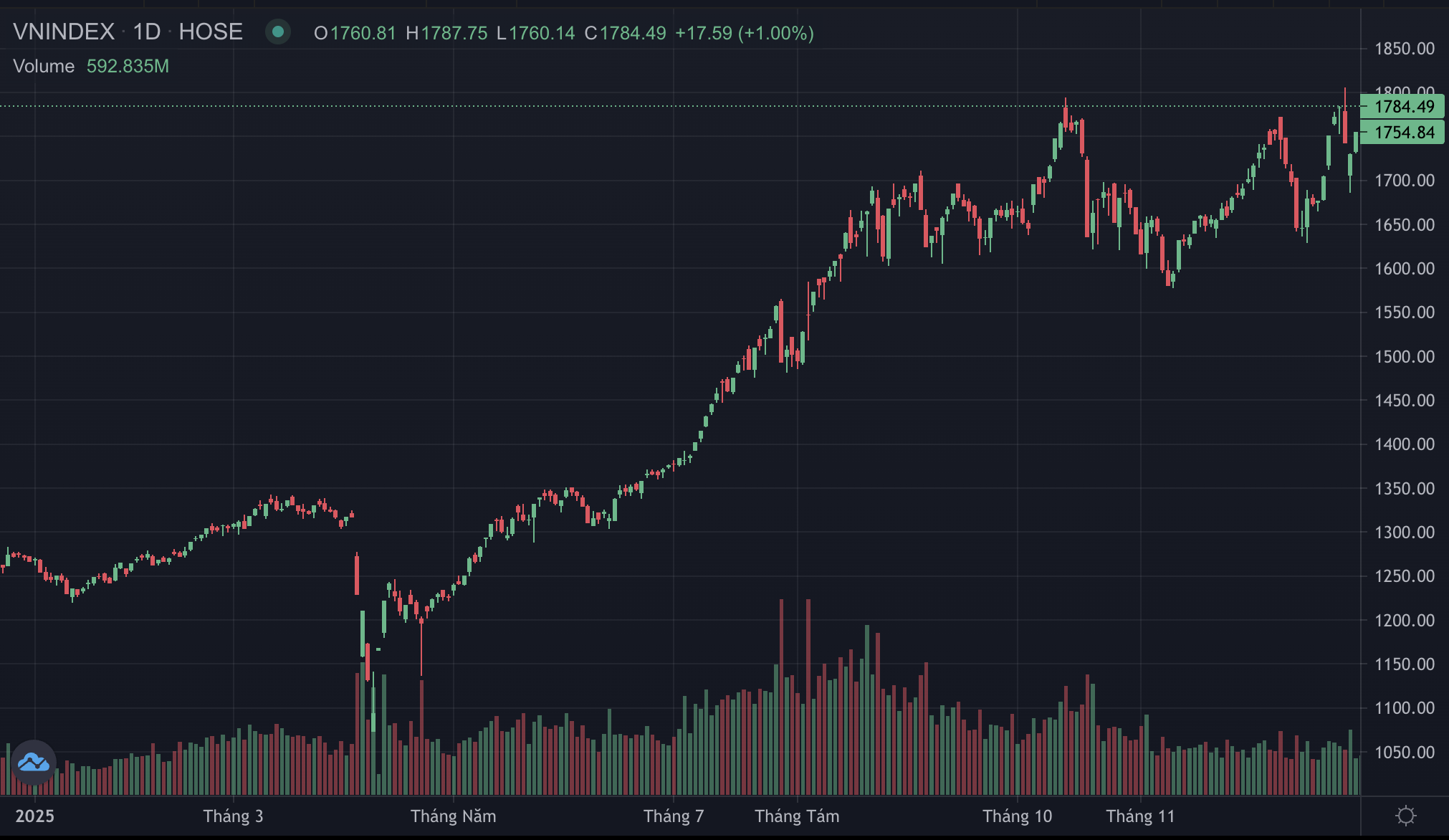 Năm 2025, thị trường chứng khoán cũng ghi nhận kỷ lục mới về điểm số, có thời điểm VN-Index đã giao dịch trên mốc 1.800 điểm. Chốt phiên giao dịch ngày 31/12/2025, VN-Index tăng gần 41% so với đầu năm.