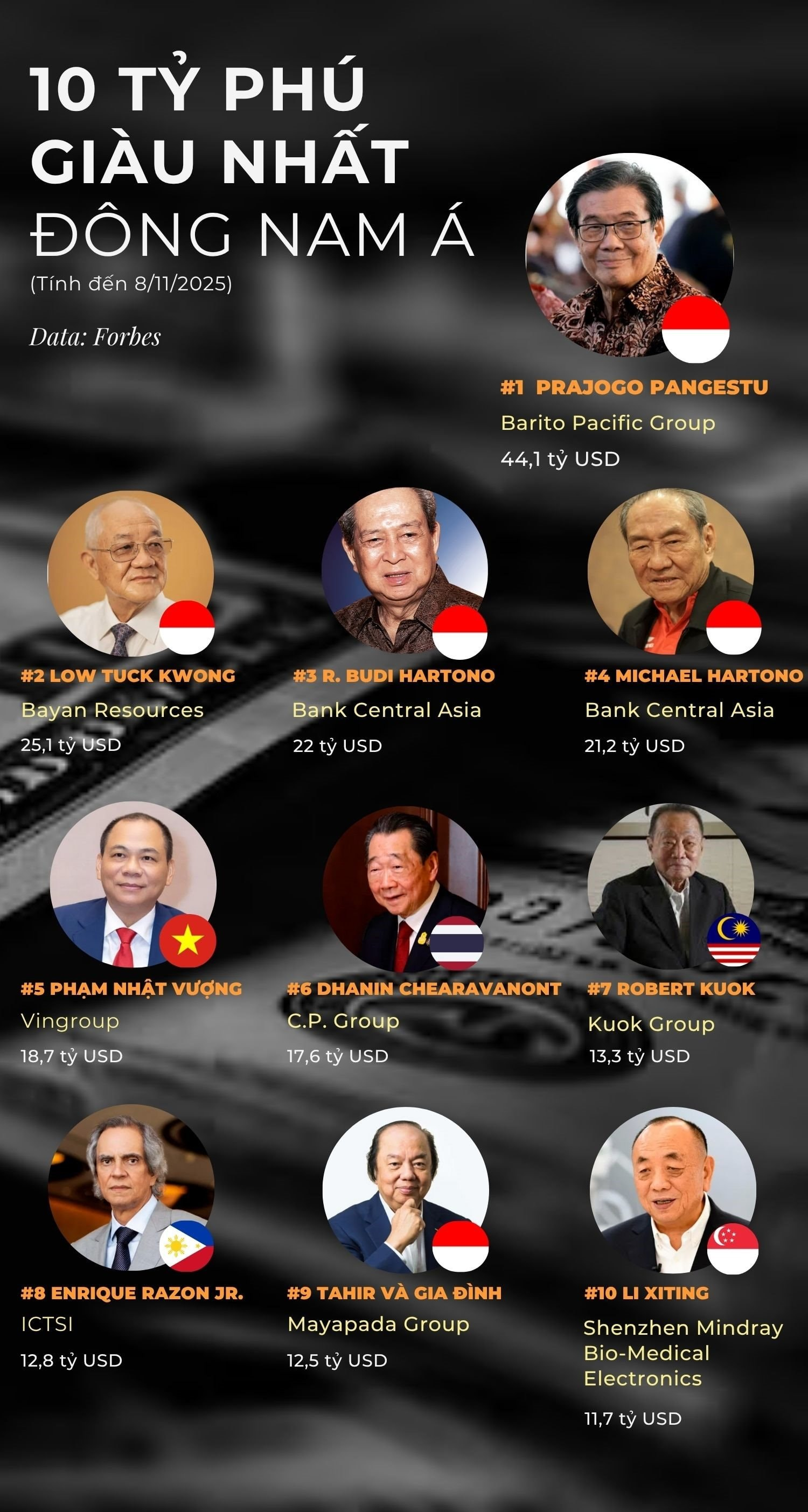 Theo dữ liệu của Forbes tại ngày 8/11/2025, người giàu nhất Đông Nam Á hiện nay là tỷ phú Prajogo Pangestu đến từ Indonesia với khối tài sản đạt 44,1 tỷ USD, tăng 24,1 tỷ USD so với thời điểm Forbes công bố danh sách tỷ phú thế giới năm 2025. Ông Prajogo Pangestu hoạt động chủ yếu trong lĩnh vực hóa dầu và năng lượng thông qua các công ty như Barito Pacific và Barito Renewables Energy. Ông Prajogo Pangestu bắt đầu góp mặt trong bảng xếp hạng tỷ phú của Forbes từ năm 2017, với tài sản ước tính tại thời điểm đó ghi nhận khoảng 1,8 tỷ USD.