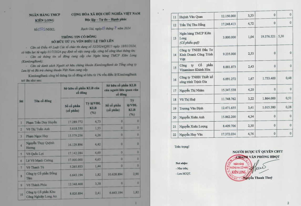 Ngân hàng TMCP Kiên Long (KienlongBank - mã: KLB) vừa công bố danh sách cổ đông nắm trên 1% vốn điều lệ tính tại ngày 29/7, theo yêu cầu của Luật Các tổ chức tín dụng (sửa đổi).