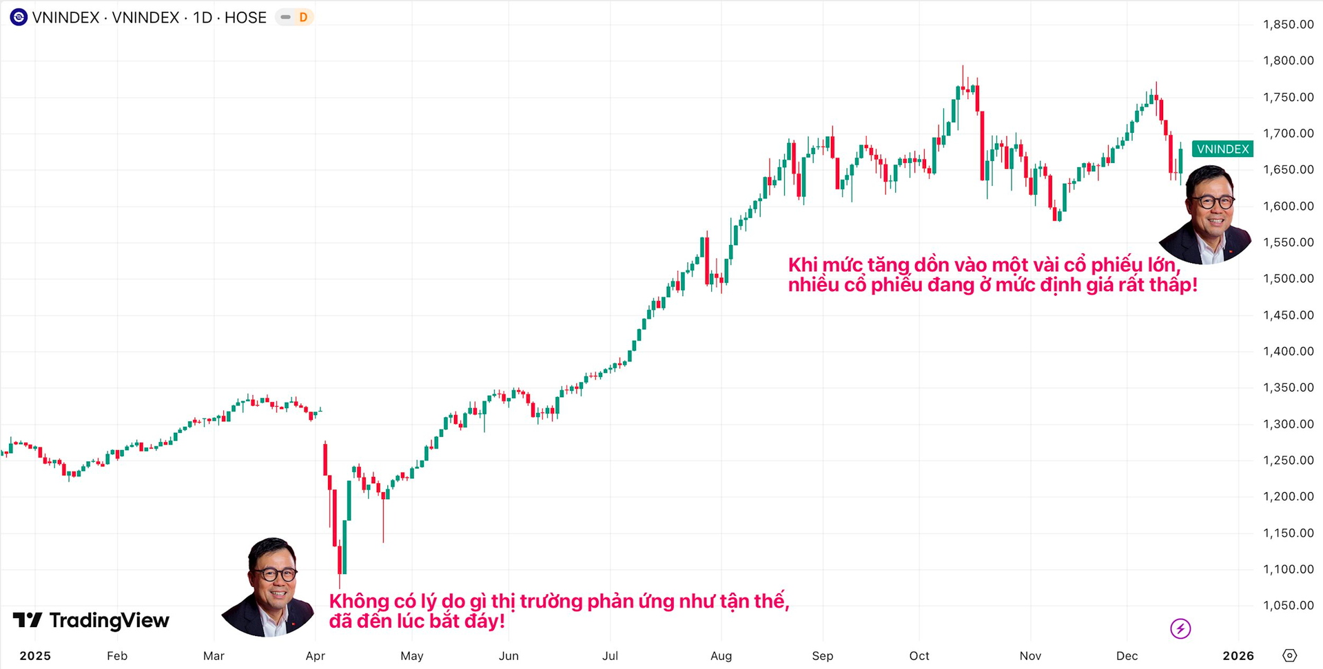 Điển hình như phiên 16/12 vừa qua, ông Nguyễn Duy Hưng đã có chia sẻ trên trang facebook cá nhân sau khi thị trường có nhịp giảm 100 điểm từ đỉnh gần nhất. “Khi mức tăng dồn vào một vài cổ phiếu lớn, nhiều cổ phiếu đang ở mức định giá rất thấp!”, Chủ tịch SSI nhận định.