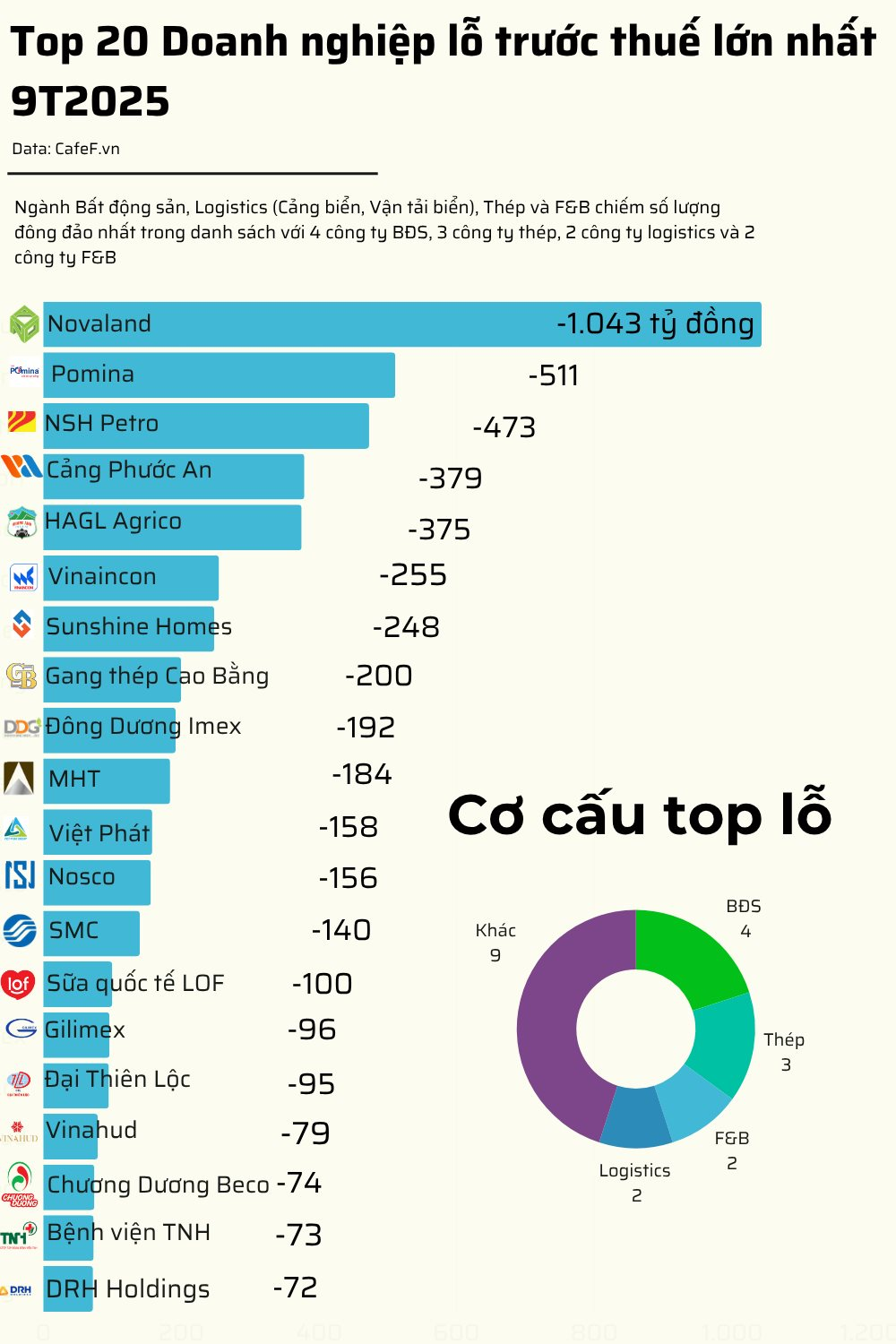Đứng đầu về mức lỗ trước thuế trong 9 tháng đầu năm là Tập đoàn Novaland với mức lỗ trước thuế 1.043 tỷ đồng. Mức lỗ đã có sự cải thiện đáng kể so với khoản lỗ 3.104 tỷ đồng. Doanh thu tài chính giảm mạnh và lỗ chênh lệch tỷ giá khiến Novaland lỗ trước thuế 782 tỷ đồng trong quý 3/2025.