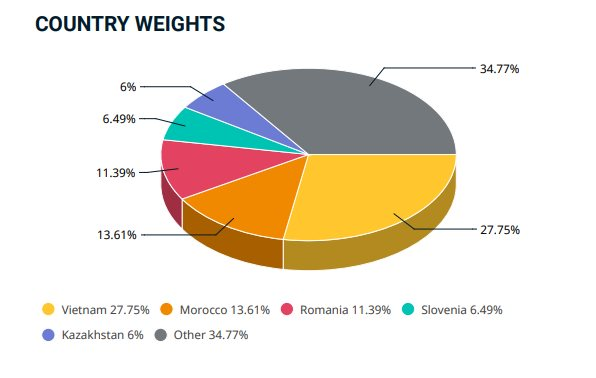 Tại ngày 31/10, Việt Nam vẫn là quốc gia chiếm tỷ trọng cao nhất trong rổ chỉ số của MSCI Frontier Market Index với tỷ lệ 27,75%. Xếp thứ 2 là Morocco với 13,61%. Trong top 10 cổ phiếu chiếm tỷ trọng cao nhất, đại diện Vingroup (VIC) đứng top 1; theo sau Việt Nam cũng góp mặt 2 đại diện khác là Vinhomes (VHM) và Hòa Phát (HPG), lần lượt xếp thứ 6 và thứ 7.
