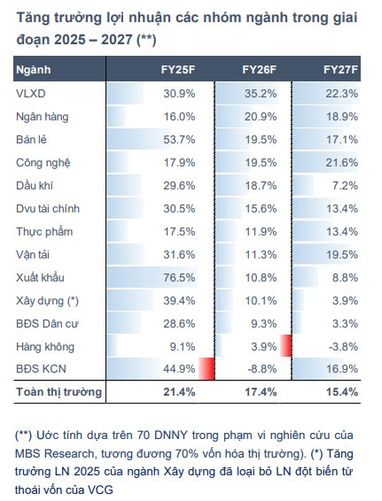 Với nhóm bán lẻ, lợi nhuận được dự báo tăng ổn định 19,5%, chủ yếu nhờ sự phục hồi của tiêu dùng thiết yếu. MBS cho rằng sản xuất và đầu tư công tăng tốc sẽ thúc đẩy việc làm trong các lĩnh vực thâm dụng lao động, cùng với các chính sách tài khóa hỗ trợ như kéo dài giảm thuế VAT 8% đến năm 2026, giảm học phí và nâng mức giảm trừ gia cảnh.