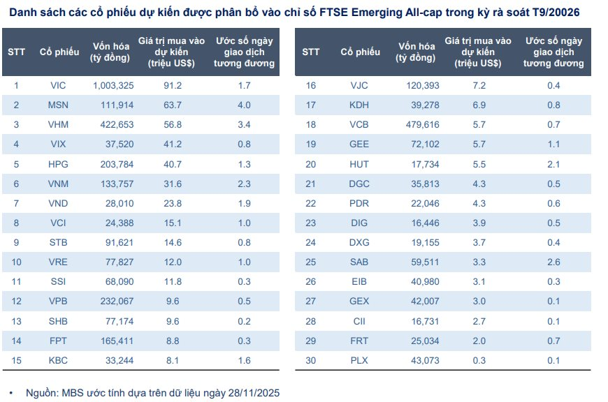 Dựa trên các tiêu chí lựa chọn của bộ chỉ số FTSE Global All-Cap như quy mô vốn hóa, tỷ lệ free-float, room ngoại và thanh khoản, MBS đã mô phỏng danh mục cổ phiếu có khả năng được đưa vào chỉ số này trong kỳ rà soát dự kiến vào tháng 9/2026.