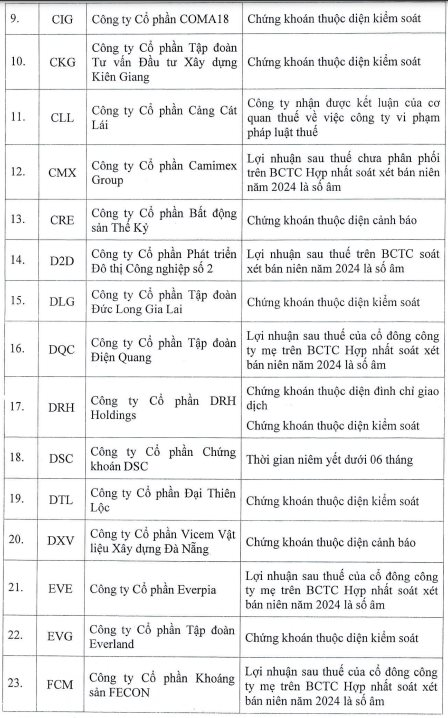 Cụ thể, danh sách cắt margin quý 1/2025 vẫn bao gồm những cổ phiếu quen thuộc nằm trong diện bị cảnh báo hoặc kiểm soát như AAT, AGM, APH, ASP, BCE, C47, CIG, CKG, CRE, DAG, DLG, DGC, DXV, EVG, FDC, FCM, HAG, HNG, HVN, HVX, ICT, ITA, JVC, KPF, LEC, LGL, MDG, NVL, NVT, OGC, PIT, PMG, PSH, PTL, RDP, SMC, SRF, SVD, TCR, TDC, TDH, TNI, TPC, TSC, TTF, TVB, VAF, VNE.…