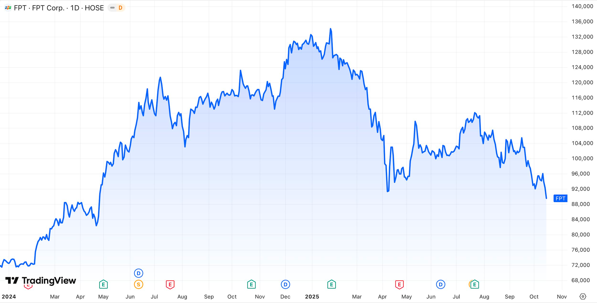 Bất chấp thị trường chứng khoán quanh vùng đỉnh, cổ phiếu FPT tiếp tục trượt dài dò đáy. Kết phiên 15/10, FPT mất thêm 3% thị giá, qua đó lùi xuống dưới 90.000 đồng/cp. Đây là mức thấp nhất trong khoảng 18 tháng trở lại đây. Thậm chí, thị giá hiện tại của FPT còn thấp hơn cả vùng đáy thuế quan hồi giữa tháng 4 năm nay.