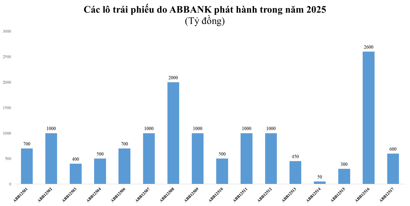 Cụ thể, ABBANK đã phát hành 2.600 trái phiếu mã ABB12516 với mệnh giá 1 tỷ đồng mỗi trái phiếu, huy động về 2.600 tỷ đồng. Ngân hàng cũng phát hành 600 trái phiếu mã ABB12517, với tổng mệnh giá 600 tỷ đồng.