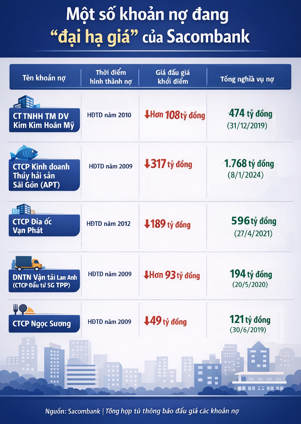 Bên cạnh khoản nợ trên, Sacombank đang tiếp tục rao bán các khoản nợ trị giá hàng trăm tỷ đồng, thậm chí lên đến hơn 1.000 tỷ đồng kéo dài nhiều năm và từng được ngân hàng rao bán nhiều lần nhưng không tìm được người mua.