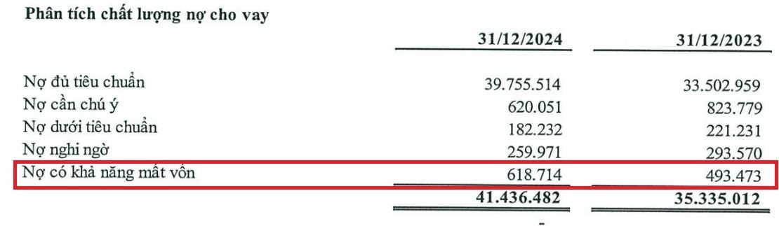 Về chất lượng tín dụng, tính đến 31/12/2024, tổng nợ xấu của PGBank tăng 5% so với đầu năm, lên mức 1.061 tỷ đồng. Đáng chú ý, nợ có khả năng mất vốn đang chiếm đến 58% tổng nợ xấu của nhà băng.