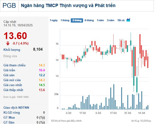 Trên thị trường chứng khoán, kết phiên 18/04, giá cổ phiếu PGB giảm 4,9% xuống 13.600 đồng/cổ phiếu, khối lượng cổ phiếu giao dịch khớp lệnh đạt hơn 8,1 nhìn đơn vị.