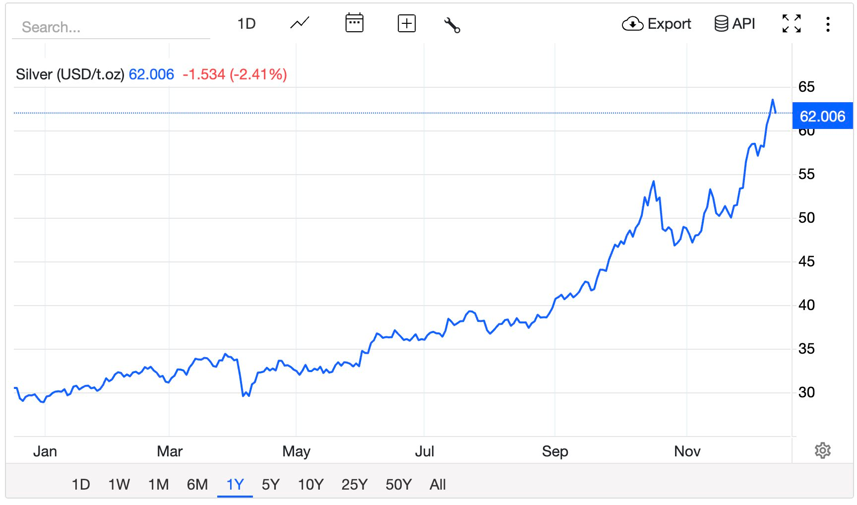 Giá kim loại này đã đạt gần 64 USD/ounce vào ngày 12/12, đánh dấu mức cao nhất mọi thời đại rồi rơi nhanh về mức 62 USD/ounce. Mặc dù vậy tính từ đầu năm, giá bạc đã tăng vọt cỡ 100%.