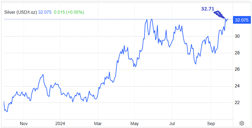 Giá bạc thế giới hôm thứ Năm (26/9) đạt 32,71 USD/ounce, mức cao nhất kể từ tháng 12 năm 2012.