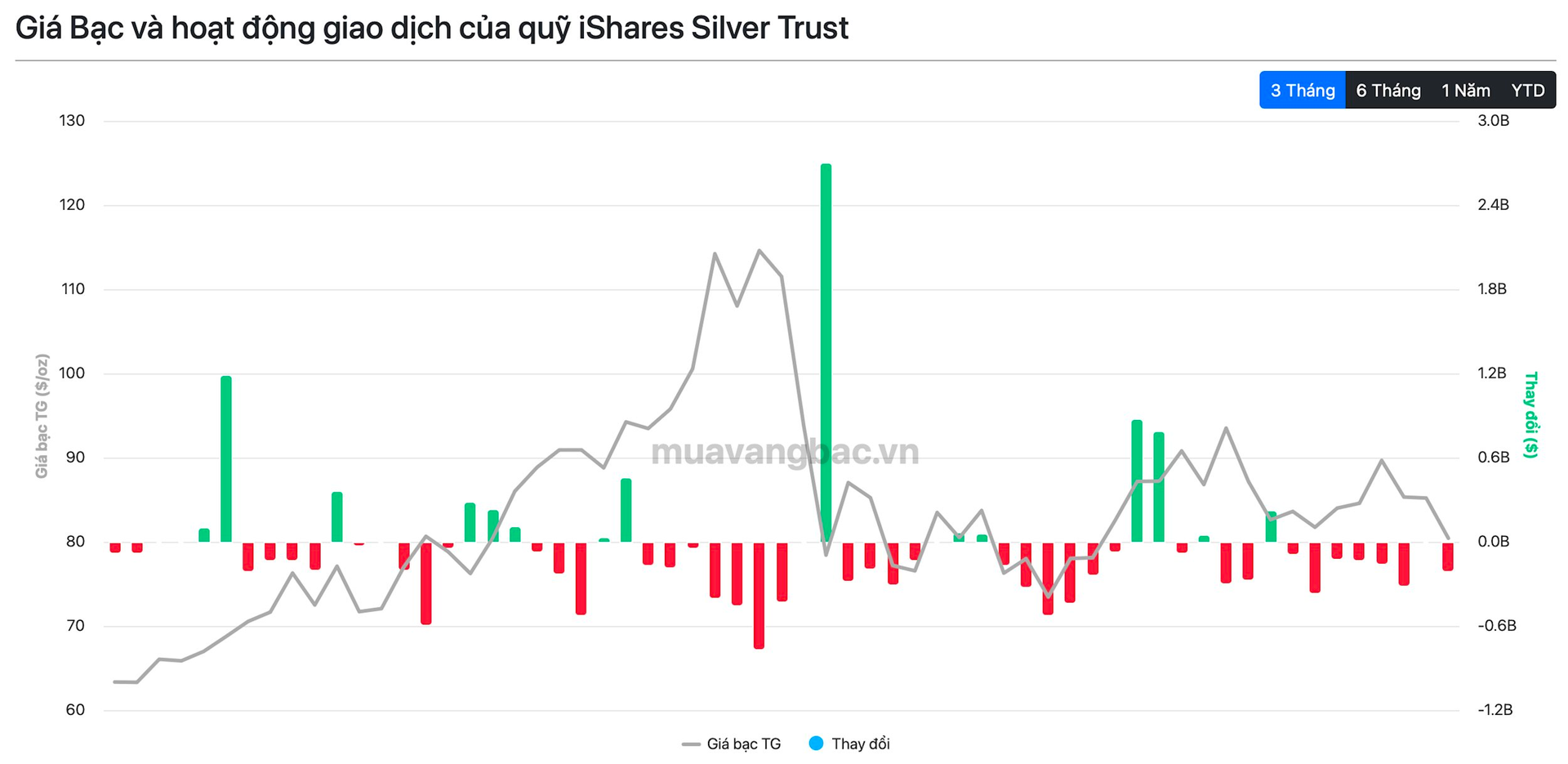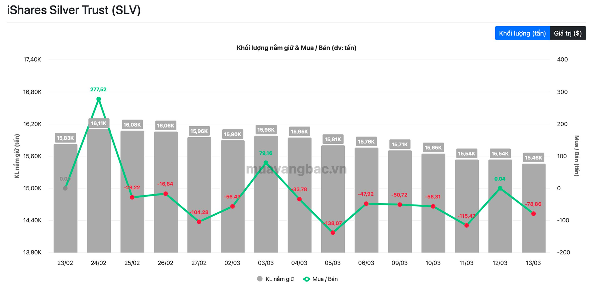 Trong bối cảnh đó, iShare Silver Trust (SLV) cũng có một tuần miệt mài bán ròng, với tổng khối lượng lên đến hơn 300 tấn. Tính đến thời điểm hiện tại, SLV còn nắm khoảng 15.500 tấn bạc, tương ứng 41,6 tỷ đồng. Đây vẫn là quỹ ETF bạc lớn nhất thế giới do gã khổng lồ BlackRock quản lý.