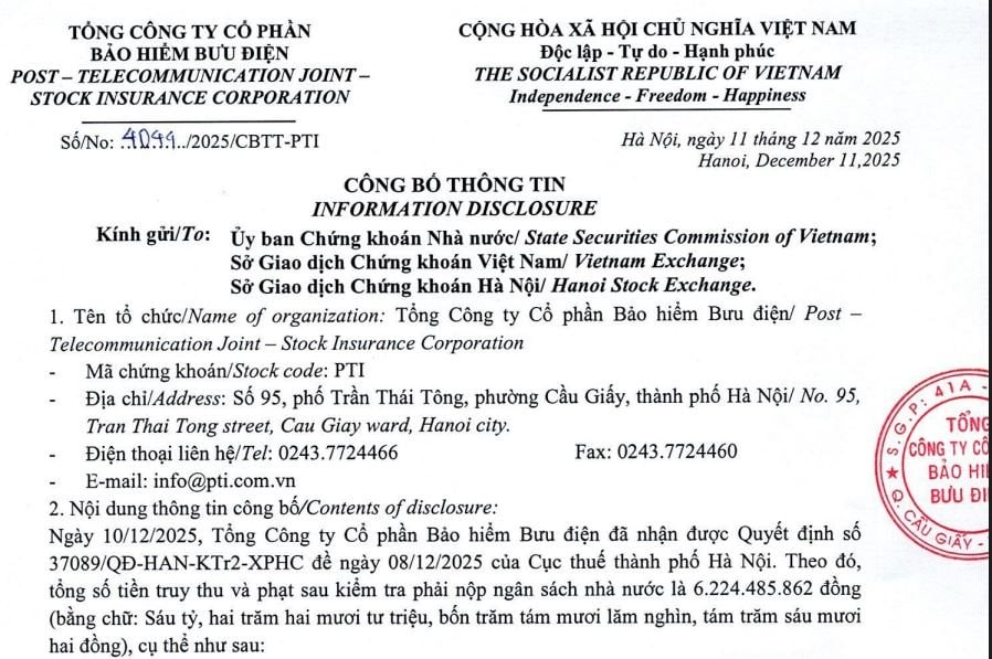 Theo đó, ngày 10/12/2025, PTI đã nhận được Quyết định số 37089/QĐ-HAN-KTr2-XPHC đề ngày 8/12/2025 của Thuế TP.Hà Nội. Theo đó, tổng số tiền truy thu và phạt sau kiểm tra phải nộp ngân sách nhà nước là 6.224.485.862 đồng.