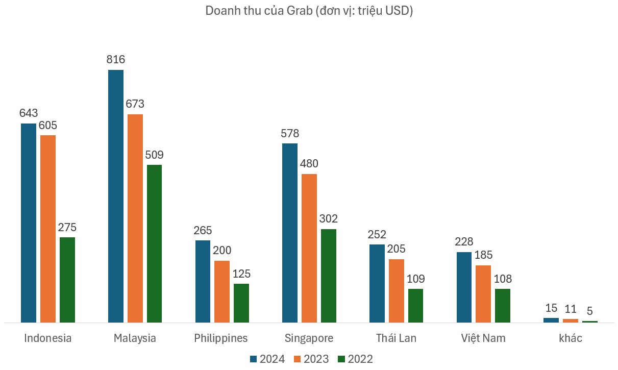 Báo cáo gần nhất cho thấy tại Việt Nam, Grab đạt doanh thu 108 triệu USD năm 2022, 185 triệu USD năm 2023, và 228 triệu USD năm 2024 (tương đơng khoảng khoảng 5.700 tỷ đồng).