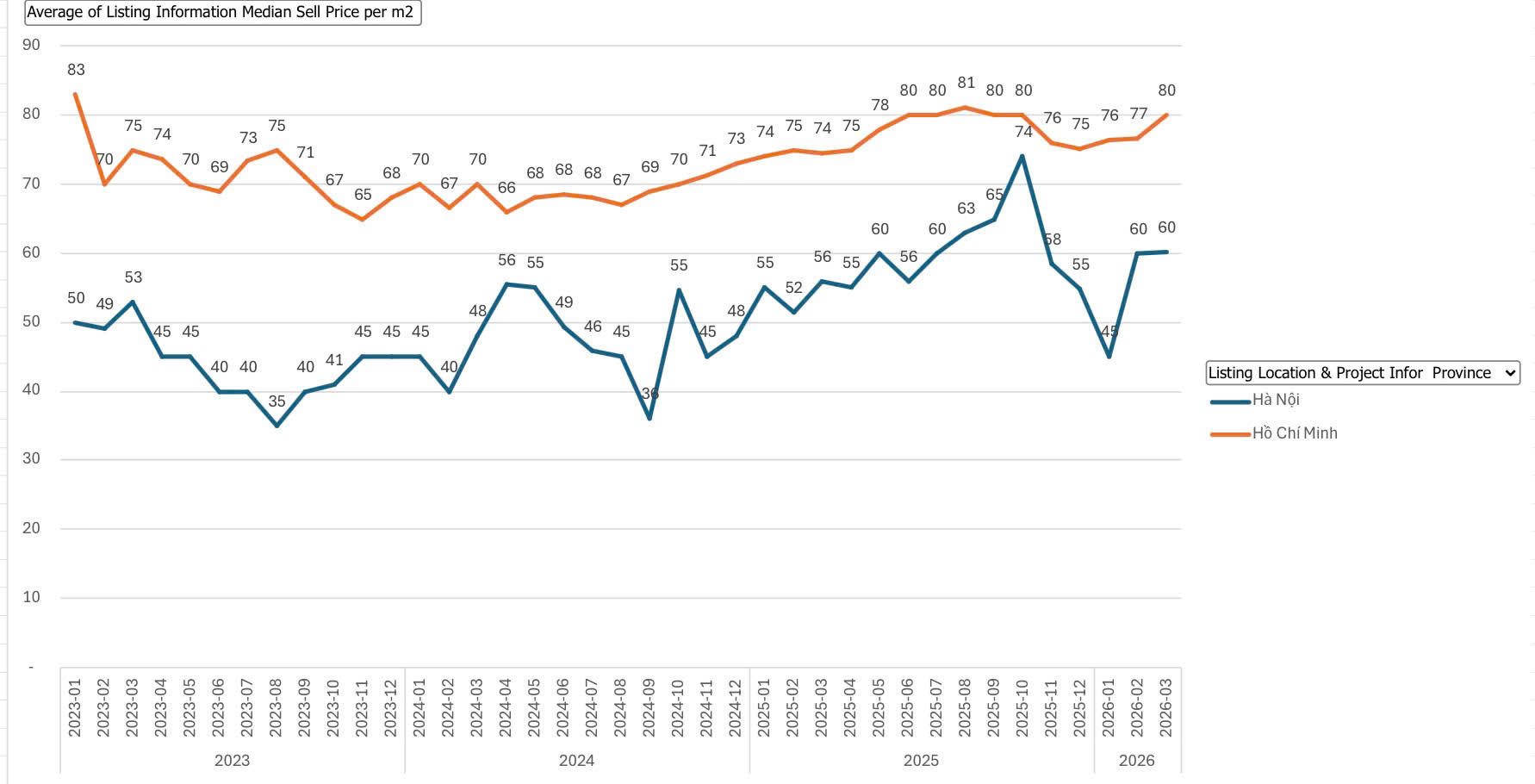 Cụ thể, tại Hà Nội, giá căn hộ từ khoảng 40 triệu/m2 tăng lên gần 87 triệu/m2. Tại TP. Hồ Chí Minh từ 46 triệu/m2 lên khoảng 75 triệu/m2. Đáng chú ý, Hà Nội tăng mạnh hơn TP. Hồ Chí Minh.