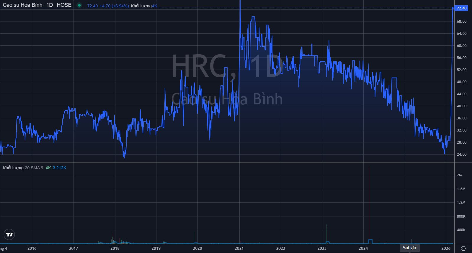 Giữa lúc thị trường hoảng loạn bán tháo, một cổ phiếu HOSE gây chú ý khi ngược dòng tăng kịch trần. Cụ thể, mã HRC của CTCP Cao su Hòa Bình tăng phiên thứ 14 liên tiếp, trong đó kịch trần 12 phiên. Thị giá bứt phá hơn 154% chỉ trong chưa đầy một tháng.