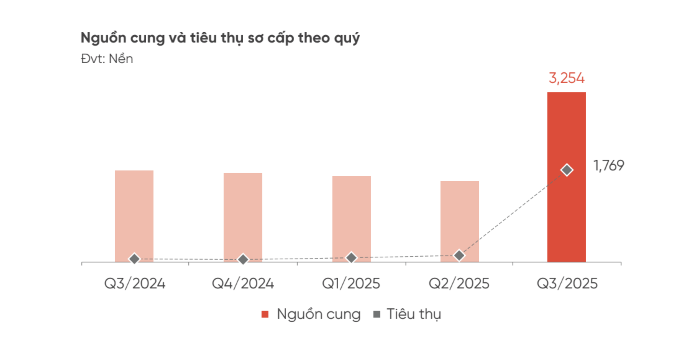 Theo đó, ở phân khúc đất nền, nguồn cung sơ cấp ghi nhận mức tăng 85% so với cùng kỳ năm 2024. Nguồn cung mới cũng đạt được nhiều tín khởi sắc với hơn 1.800 sản phẩm được mở bán mới trong quý 3, đóng góp khoảng 56% vào tỷ trọng cung sơ cấp của thị trường.