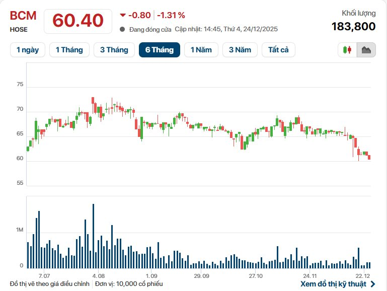 Trên thị trường chứng khoán, kết phiên 24/12, giá cổ phiếu BCM ở mức 60.400 đồng/cổ phiếu, giảm 1,31% so với phiên trước, khối lượng cổ phiếu giao dịch khớp lệnh đạt 183,8 nghìn đơn vị.