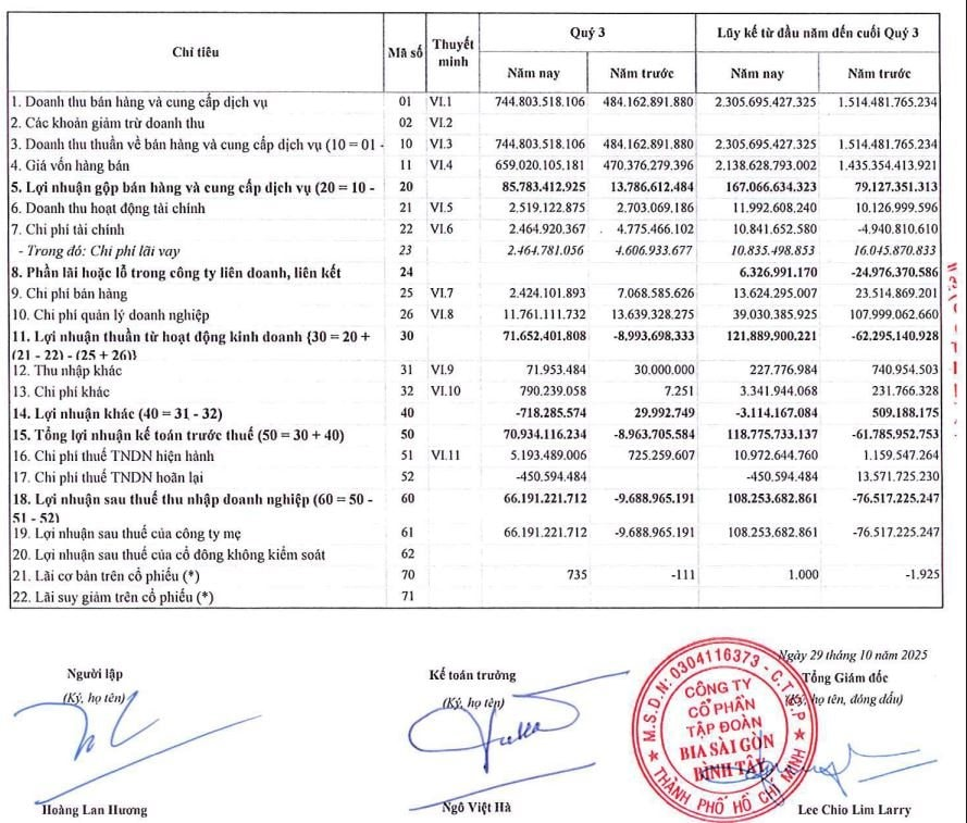 Lũy kế 9 tháng đầu năm 2025, Sabibeco lãi ròng 108,25 tỷ đồng trong khi cùng kỳ năm 2024, doanh nghiệp lỗ đến 76,5 tỷ đồng.