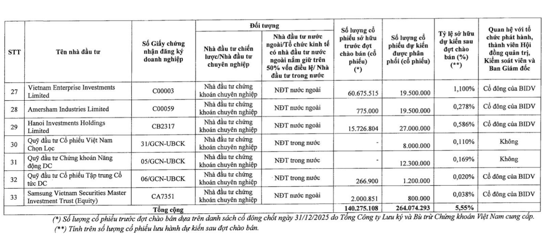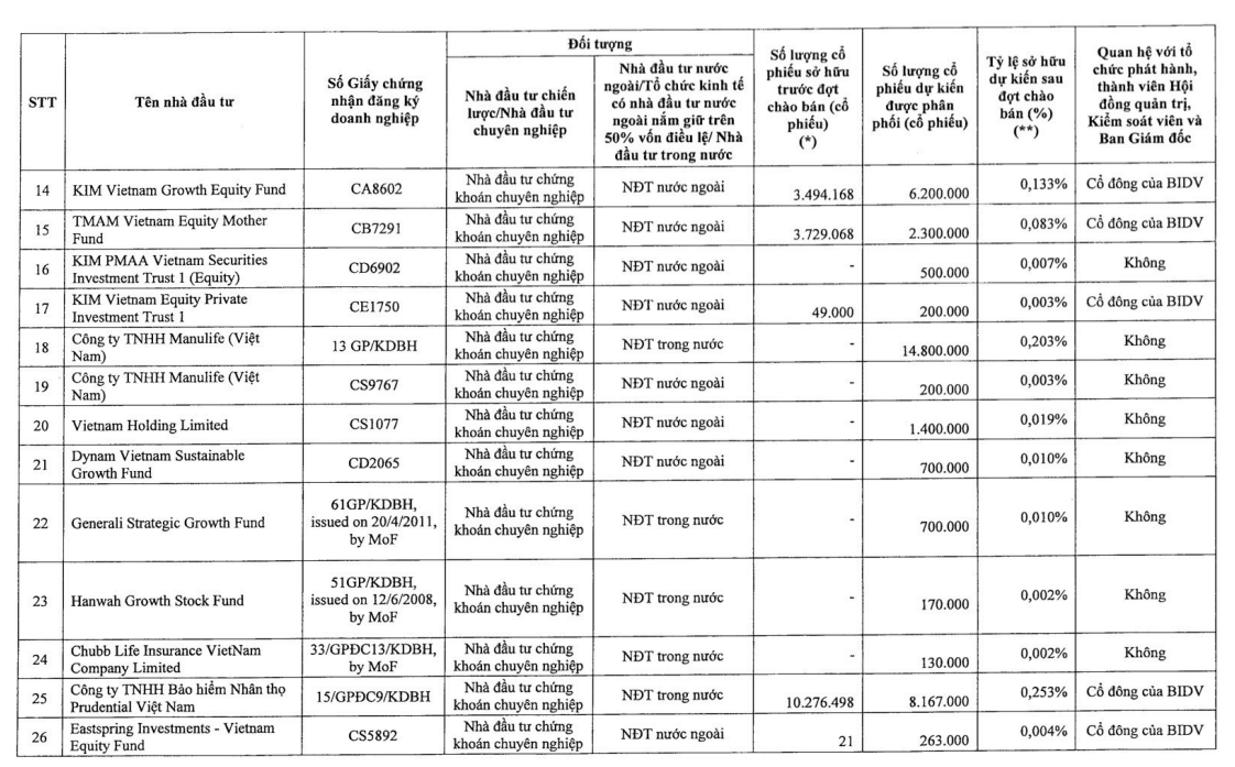 Điểm đáng chú ý của đợt phát hành là sự tham gia đăng ký của 33 nhà đầu tư chứng khoán chuyên nghiệp trong và ngoài nước, đa dạng thành phần gồm tổ chức trong nước và nước ngoài, quỹ đầu tư, công ty bảo hiểm và tổ chức Nhà nước.