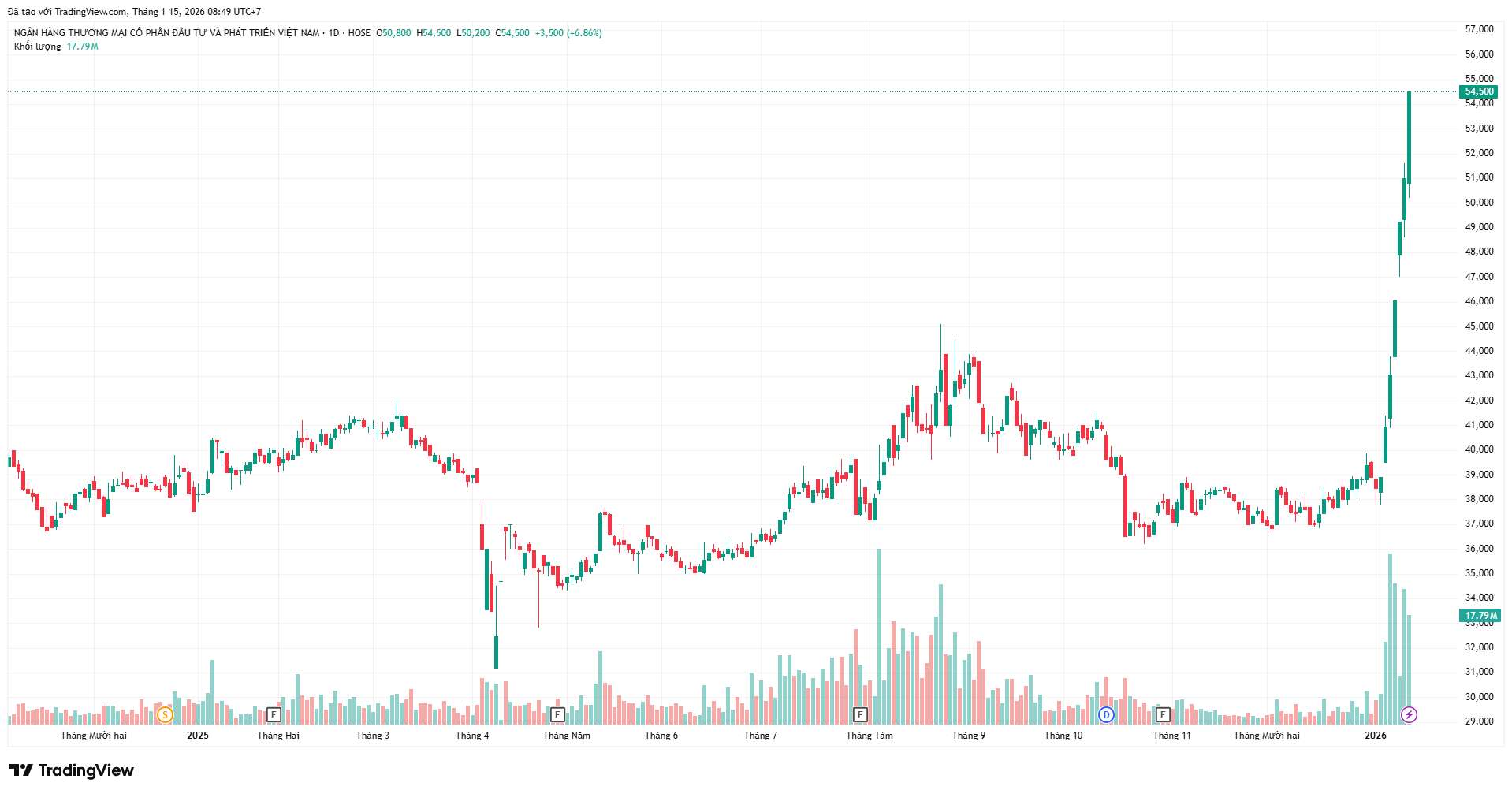 Kết thúc phiên giao dịch ngày 14/1, giá cổ phiếu BID của BIDV ở mức 54.500 đồng, tăng tới 41,7% so với đầu năm 2026.