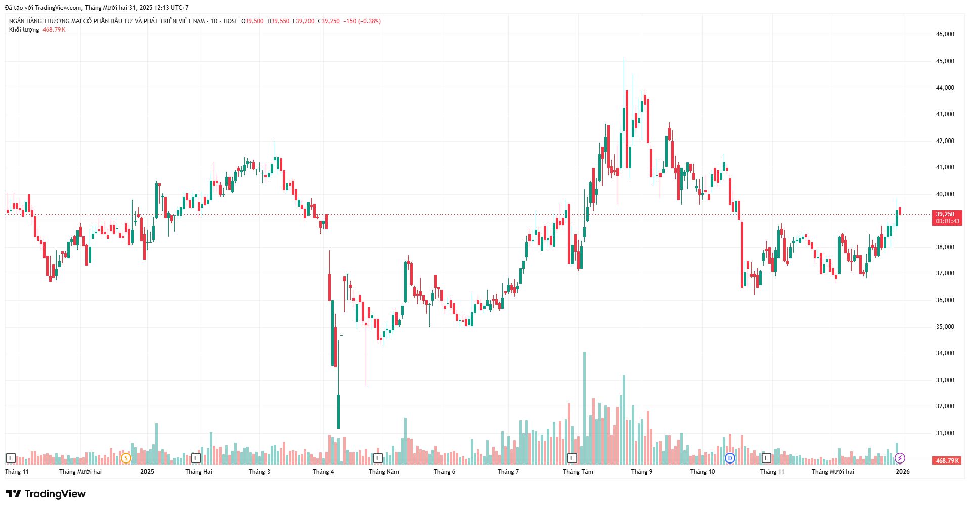 Kết thúc phiên giao dịch sáng ngày 31/12/2025, cổ phiếu BID của BIDV ở mức 39.250 đồng/cổ phiếu, tăng hơn 2,7% so với đầu năm.