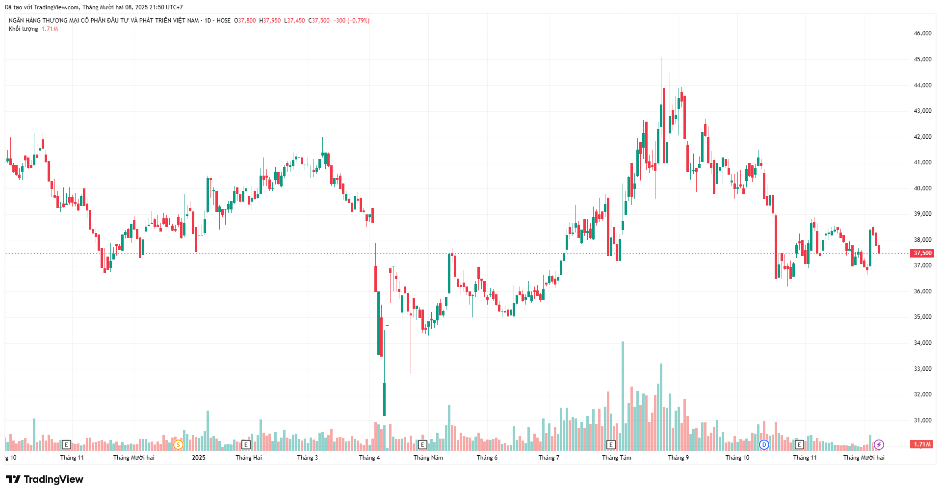 Kết thúc phiên giao dịch ngày 8/12, giá cổ phiếu BID của BIDV ở mức 37.500 đồng/ cổ phiếu, giảm khoảng 1,83 % so với đầu năm.