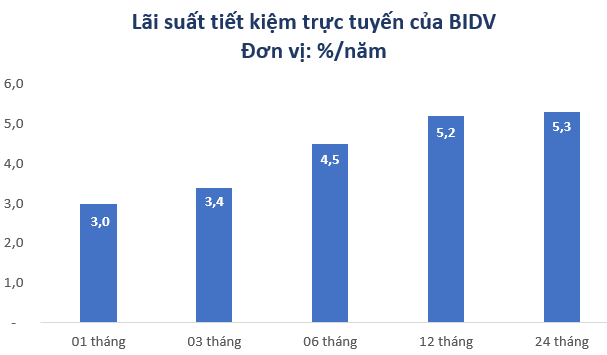 Riêng kỳ hạn 12 tháng, lãi suất tiết kiệm trực tuyến được BIDV nâng thêm 0,5%/năm, lên mức 5,2%/năm. Với các kỳ hạn dài từ 13 tháng đến 36 tháng, lãi suất huy động trực tuyến tăng trong khoảng 0,4 – 0,5%/năm, lên mức 5,3%/năm.