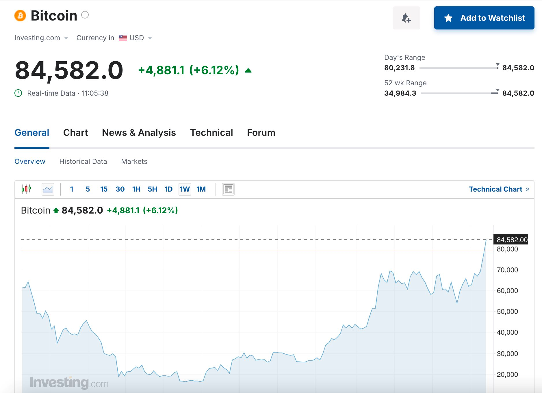 Tính tới 23h05 theo giờ Hà Nội, giá Bitcoin đã vượt 84.500 USD/coin.