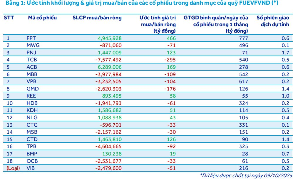 Ước tính quỹ ETF FUEVFVND sẽ thực hiện mua bán cơ cấu danh mục mới từ ngày 22/10/2025, top 3 cổ phiếu mua ròng mạnh nhất là FPT, ACB, CTD; ngược lại các 3 cổ phiếu bị bán ròng mạnh lần lượt là TCB, GMD và MBB. Hầu hết cổ phiếu đều dự kiến sẽ được quỹ này hoàn tất cơ cấu trong vòng 1 phiên giao dịch, ngoại trừ PNJ (1,7 phiên), GMD và CTD (1,4 phiên).