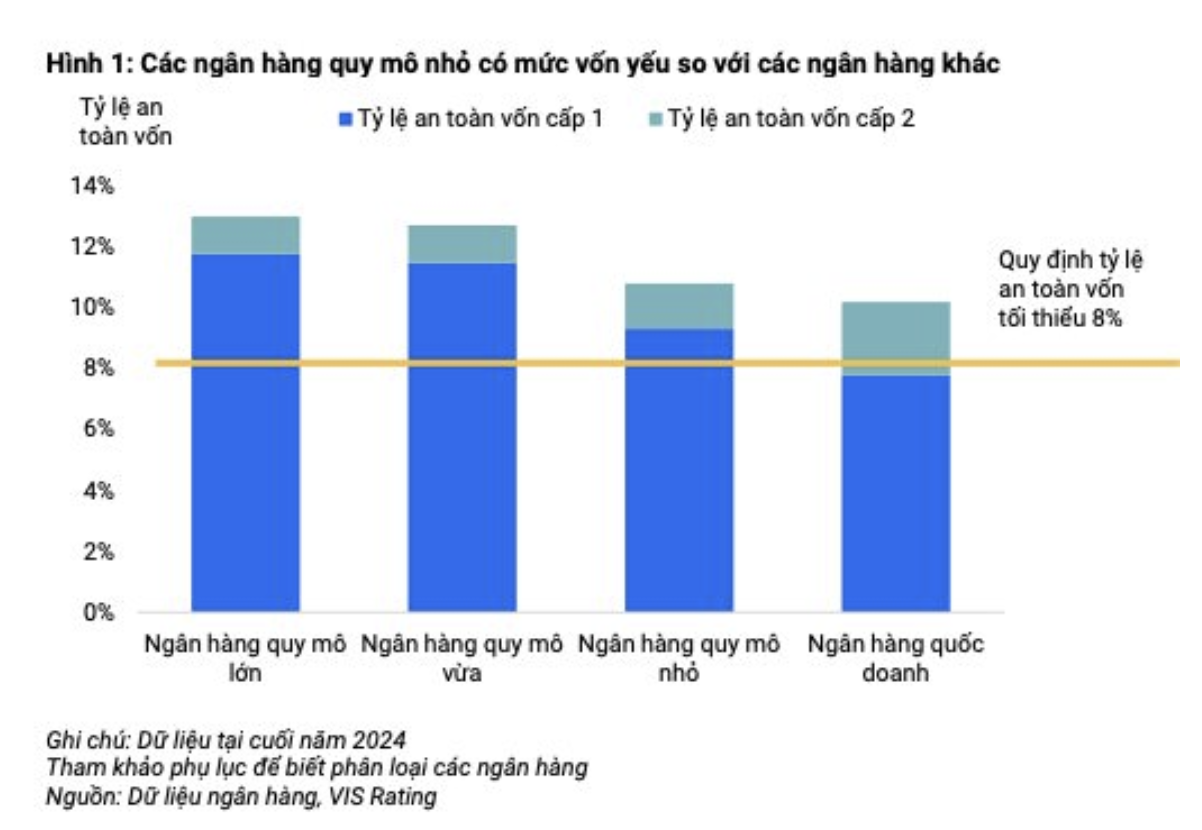 Dù vậy, các ngân hàng này vẫn đặt mục tiêu tăng trưởng tín dụng từ 16%-20% trong năm 2025 – cao hơn tăng trưởng của toàn ngành. So với các ngân hàng khác, ngân hàng nhỏ đang đối mặt với áp lực vốn lớn nhất do khả năng sinh lời hạn chế, chất lượng tài sản thấp hơn và khó khăn trong việc huy động vốn chủ sở hữu. Tỷ suất sinh lời trên tài sản bình quân (ROAA) chỉ đạt 0,6% trong giai đoạn 2020–2024, so với mức trung bình ngành là 1,4%.