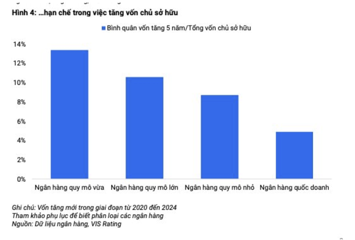Nếu không được bổ sung vốn mới, chuyên gia VIS Rating đánh giá tỷ lệ an toàn vốn (CAR) của các ngân hàng này sẽ giảm hơn 200 điểm cơ bản, kể cả khi đạt được các mục tiêu tăng trưởng tài sản và lợi nhuận vào cuối năm 2026. Thực tế cho thấy quá trình huy động vốn cổ phần của các ngân hàng ở Việt Nam có thể kéo dài hơn hai năm (ví dụ: BAB, VBB).
