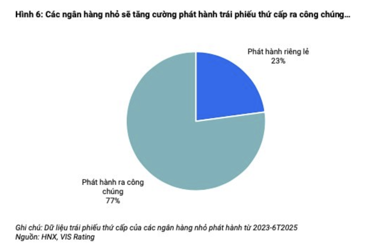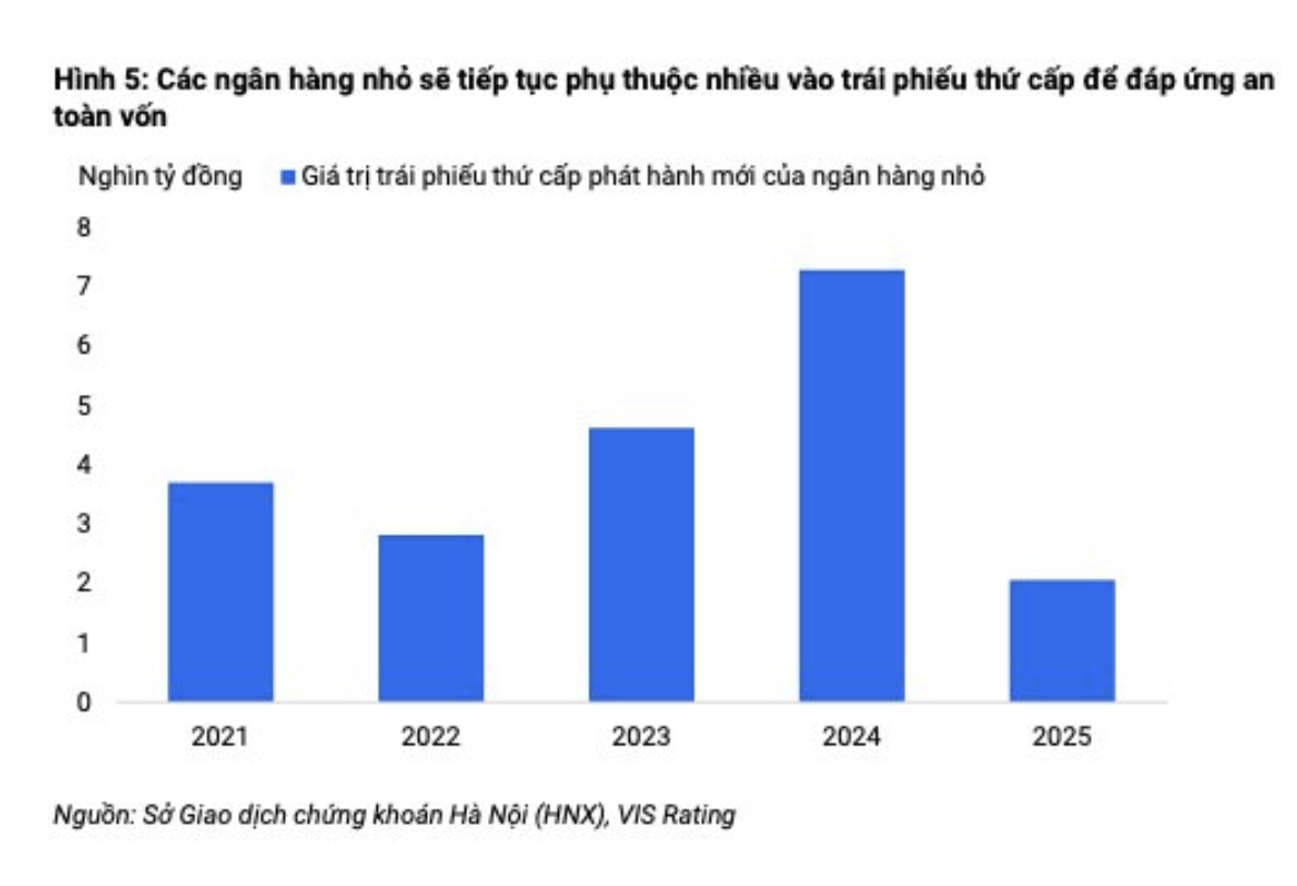 Để đáp ứng nhu cầu vốn, các ngân hàng nhỏ sẽ tiếp tục phụ thuộc nhiều vào trái phiếu thứ cấp. Thông tư 412 cho phép trái phiếu thứ cấp được tính vào vốn cấp 2, nhờ đó giúp các ngân hàng đạt được mức CAR 8% theo quy định mà không bị pha loãng vốn cổ phần. VIS Rating đánh giá các ngân hàng nhỏ sẽ tăng cường phát hành trái phiếu thứ cấp (trái phiếu tăng vốn cấp 2) ra công chúng nhằm đáp ứng nhu cầu mạnh mẽ của nhà đầu tư cá nhân.