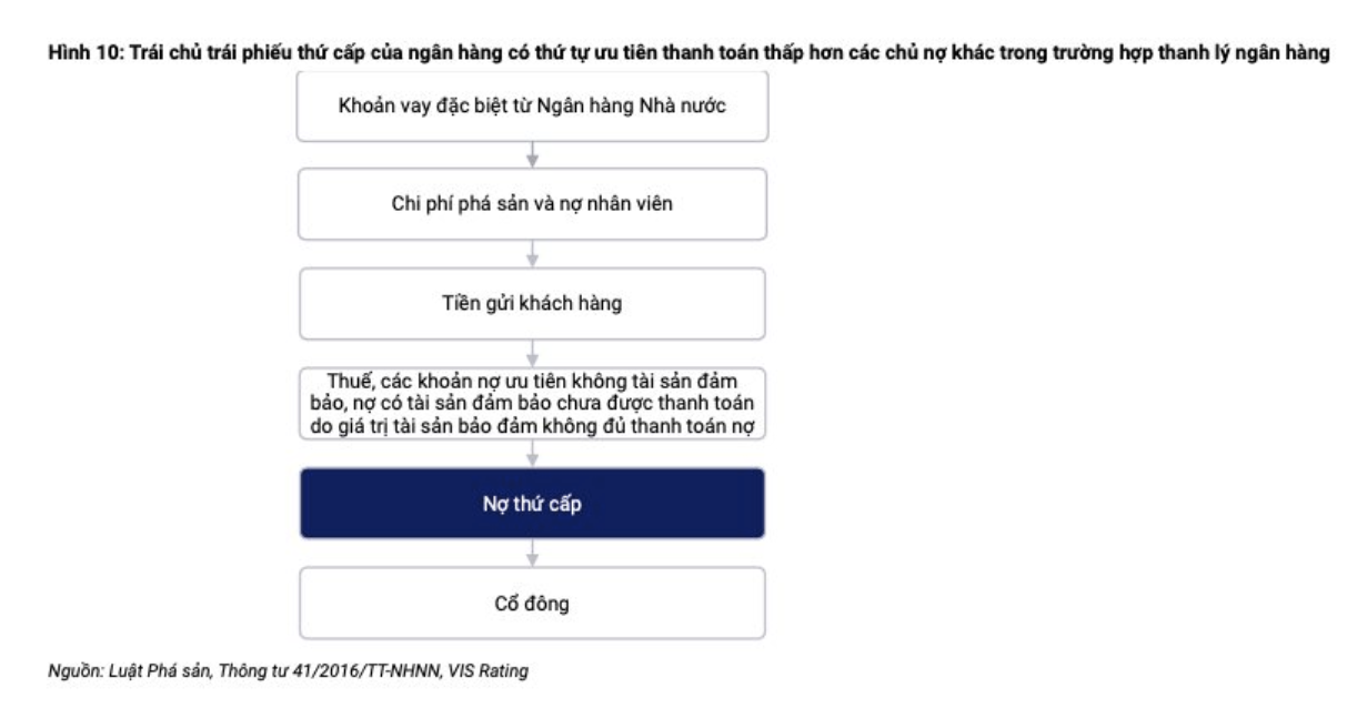 Trái phiếu thứ cấp có mức độ rủi ro khác biệt đáng kể so với các khoản nợ ưu tiên không có bảo đảm. Các công cụ này đủ điều kiện được tính vào vốn cấp 2 nhằm hấp thụ tổn thất trong các giai đoạn thị trường căng thẳng. Theo Thông tư 41, nhà đầu tư trái phiếu thứ cấp của ngân hàng có thứ tự ưu tiên thanh toán thấp hơn các chủ nợ khác trong trường hợp phá sản ngân hàng.