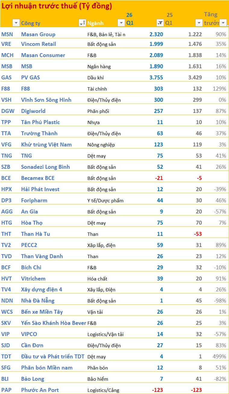 Masan Group (MSN) báo lãi trước thuế quý 1/2026 đạt 2.320 tỷ đồng, tăng trưởng tới 90% so với cùng kỳ năm 2025.