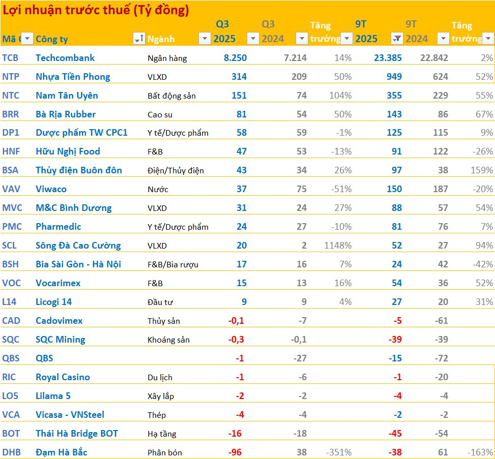 Trong 9 tháng đầu năm 2025, lợi nhuận trước thuế của Techcombank (TCB) đạt 23,4 nghìn tỷ đồng, tăng 2,4% so với cùng kỳ. Trong đó, lợi nhuận trước thuế quý 3/2025 đạt 8,3 nghìn tỷ đồng, tăng 14,4%, là mức lợi nhuận trước thuế theo quý cao nhất từ trước tới nay của Ngân hàng.