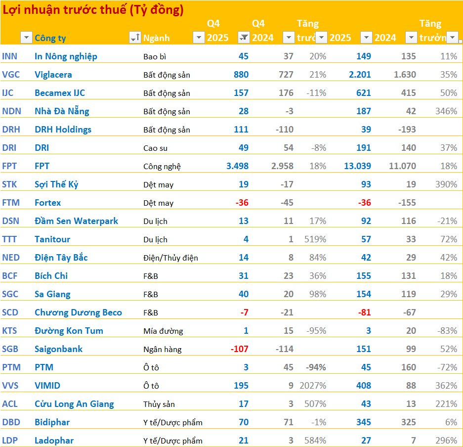 Các doanh nghiệp đã công bố BCTC quý 4/2025:
