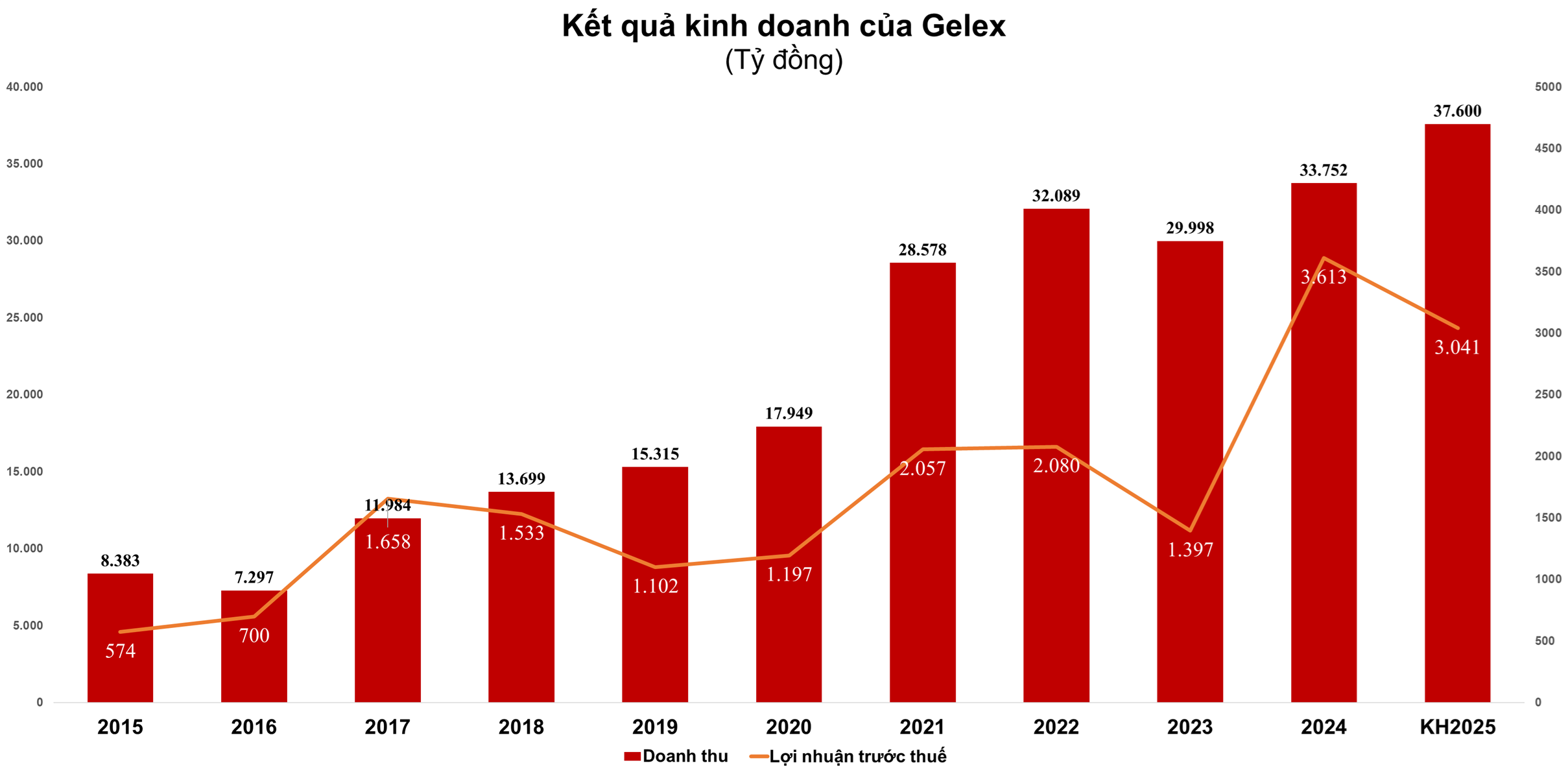 Trong khi đó, mục tiêu lợi nhuận hợp nhất trước thuế giảm 15% so với năm 2024, đạt 3.041 tỷ đồng. Theo lý giải của Ban lãnh đạo GELEX, mục tiêu lợi nhuận trước thuế hợp nhất năm nay giảm là do không còn khoản lợi nhuận bất thường từ thoái vốn các dự án năng lượng tái tạo khoảng gần 1.000 tỷ đồng như năm 2024. Tuy nhiên, nếu xét trên các hoạt động kinh doanh cốt lõi thì mức lợi nhuận này vẫn tăng trưởng 2 chữ số.