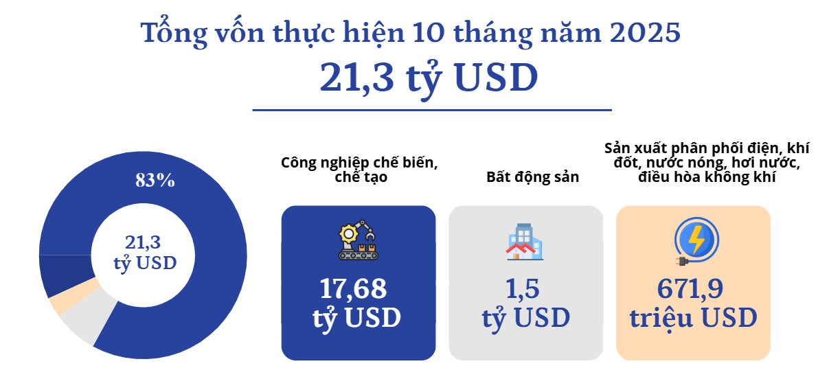 Trong cơ cấu FDI, vốn vào lĩnh vực chế biến, chế tạo tiếp tục đóng vai trò chi phối, chiếm 56,7% tổng vốn đăng ký cấp mới và tới 83% tổng vốn giải ngân trong 10 tháng năm 2025.