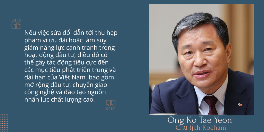Tại Diễn đàn Doanh nghiệp Việt Nam thường niên 2025, đề cập đến vấn đề sửa đổi Luật Công nghệ cao ông Ko Tae Yeon, Chủ tịch Hiệp hội Doanh nghiệp Hàn Quốc tại Việt Nam (Kocham) cho biết: “Nếu việc sửa đổi dẫn tới thu hẹp phạm vi ưu đãi hoặc làm suy giảm năng lực cạnh tranh trong hoạt động đầu tư, điều đó có thể gây tác động tiêu cực đến các mục tiêu phát triển trung và dài hạn của Việt Nam, bao gồm mở rộng đầu tư, chuyển giao công nghệ và đào tạo nguồn nhân lực chất lượng cao”. Do đó, ông nhấn mạnh rằng, cần phải đảm bảo việc sửa đổi Luật Công nghệ cao không làm suy giảm động lực của các doanh nghiệp FDI.