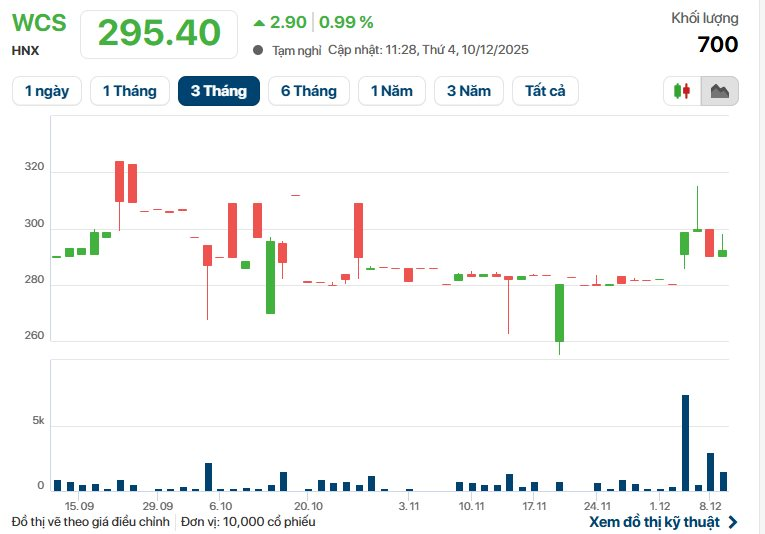Cổ phiếu WCS hiện đang có giá 295.400 đồng và là mã chứng khoán có thị giá cao nhất trên sàn HNX. Đồng thời cổ phiếu WCS cũng đang nằm trong Top 5 cổ phiếu có giá cao nhất trên sàn chứng khoán Việt Nam.
