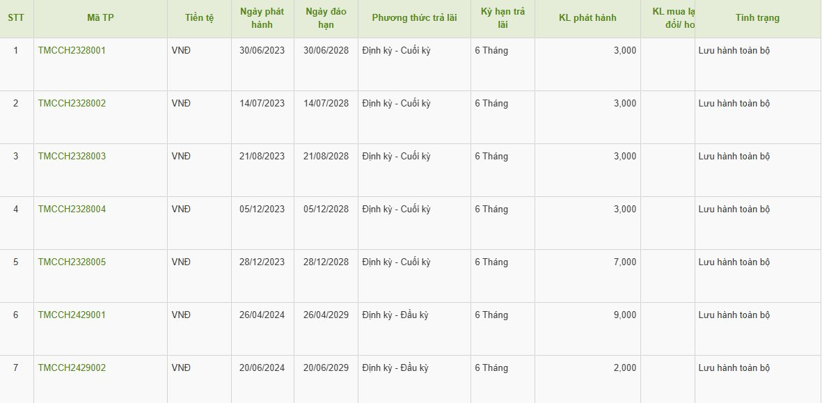 Sang năm 2024 công ty này phát hành thành công thêm 2 lô trái phiếu TMCCH2429001 (giá trị 900 tỷ đồng) và lô trái phiếu TMCCH2429002 (giá trị 200 tỷ đồng), cùng kỳ hạn 5 năm, sẽ đáo hạn vào giữa năm 2029.