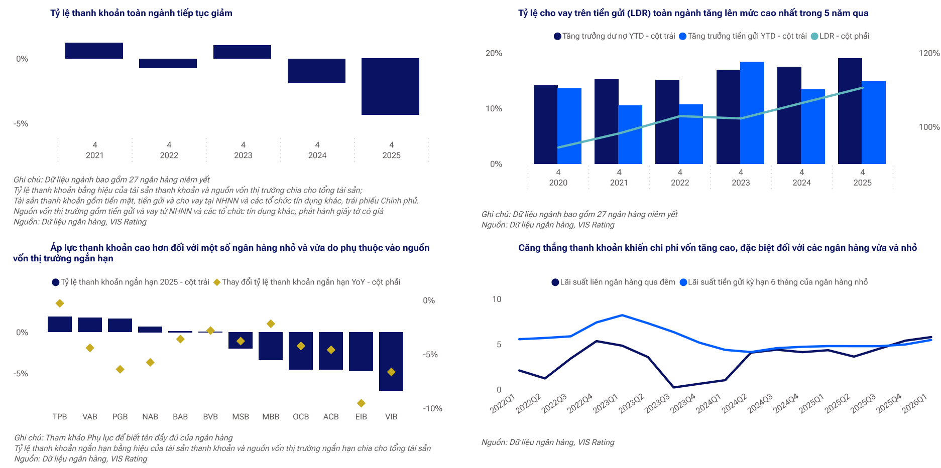 Thực tế, nền tảng thanh khoản của hệ thống vẫn đối mặt với áp lực nhất định. Năm 2025, tăng trưởng tín dụng đạt khoảng 19% trong khi huy động chỉ tăng 11,4%, khiến nhiều ngân hàng phải phụ thuộc nhiều hơn vào thị trường liên ngân hàng và phát hành trái phiếu để bù đắp nguồn vốn.